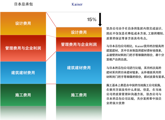 首先,施工費(fèi)用(綠色部分),無論是日本總承包公司還是Kaiser,均采用中國當(dāng)?shù)氐氖┕す臼┕?,所以只要是相同?xiàng)目,在費(fèi)用上不會有差異。但是施工中最重要的與具體施工人員順暢溝通的這一點(diǎn),Kaiser作為中國當(dāng)?shù)仄髽I(yè)的優(yōu)勢就顯現(xiàn)出來了,迅速、靈活的聯(lián)絡(luò)及管理是日本總承包公司無法比擬的。